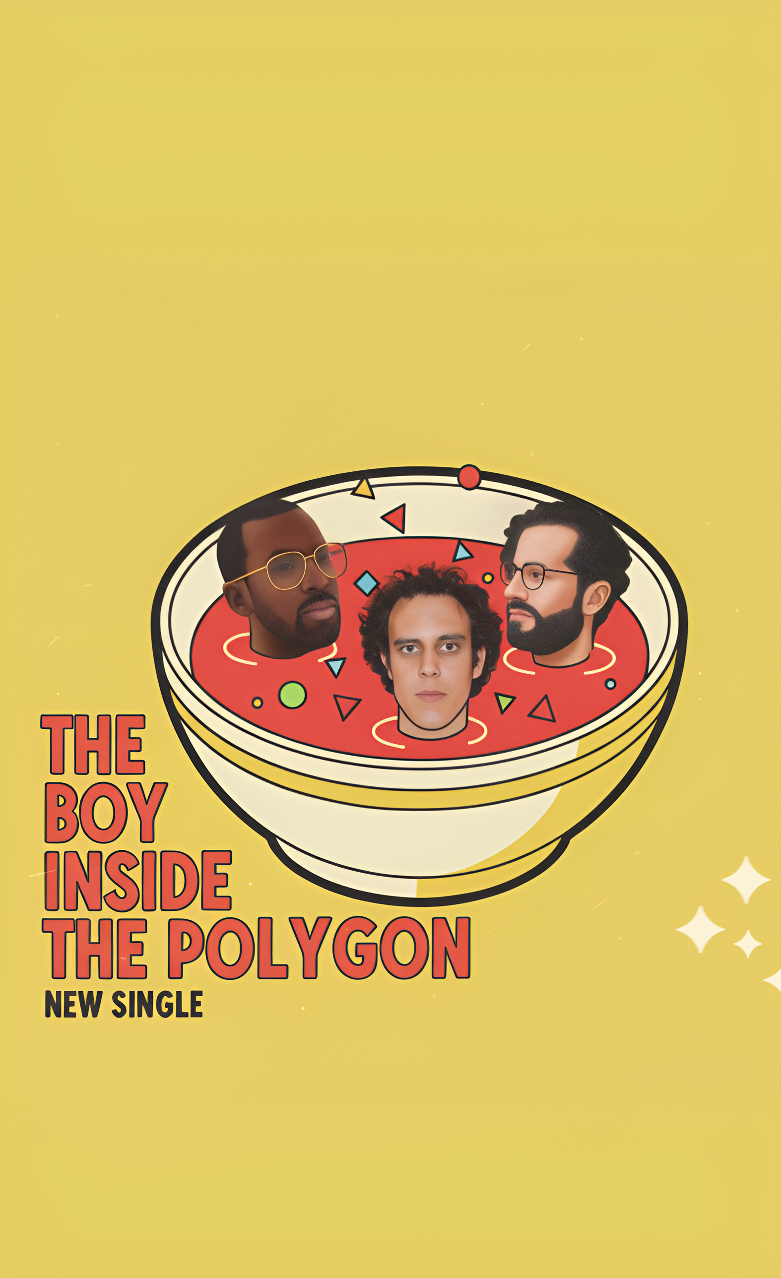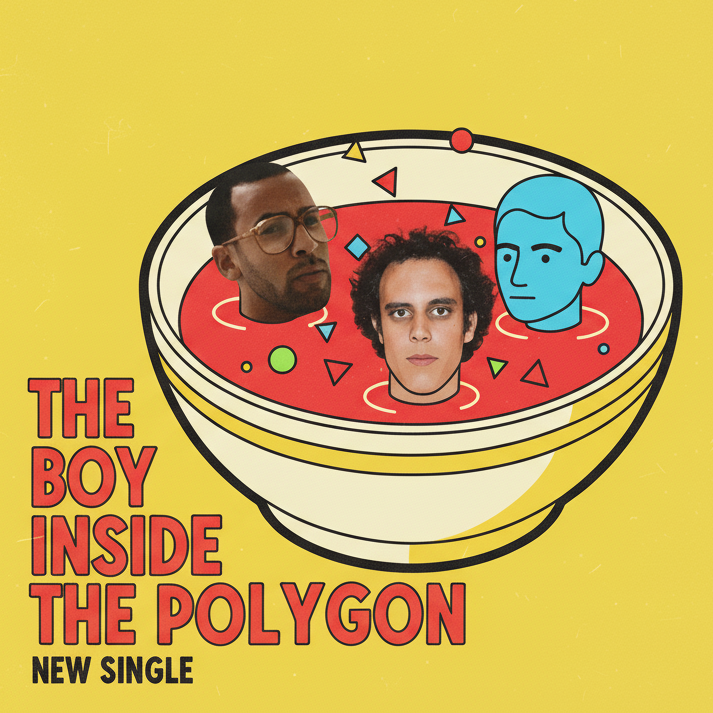 Generate me a poster with 3 heads in a bowl of soup that can be used to advertise a musical song called "The boy inside the polygon"